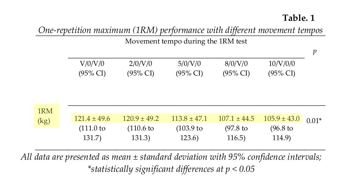 The results showed the V/0/V/0 and 2/0/V/0 protocols resulted in a significantly greater 1RM than the slower 5/0/V/0, 8/0/V/0 and 10/0/V/0 protocols.