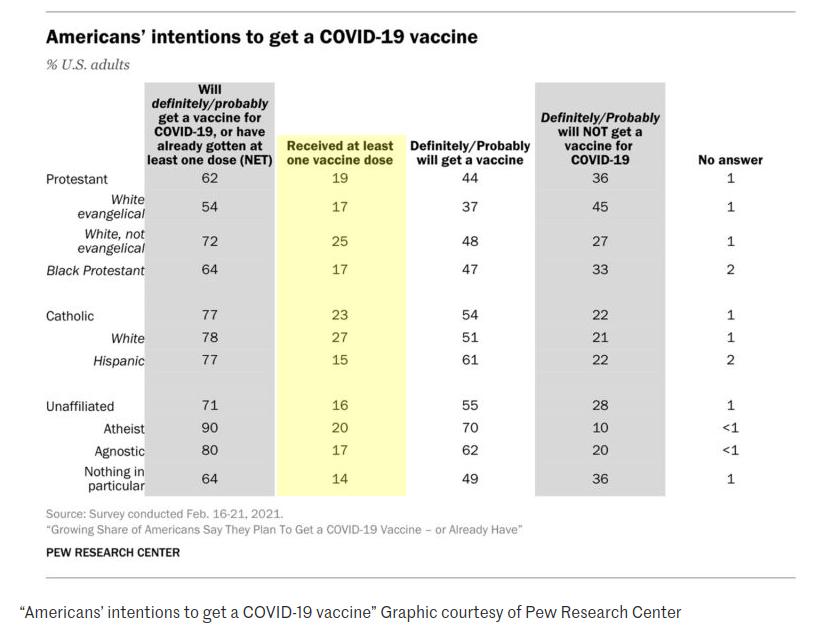 Actual vaxxxination rates at this early stage of the Great COVID Con among the over 10,000 US participants were similar among atheists, Protestants and Catholics (20%, 19% and 23%, respectively).