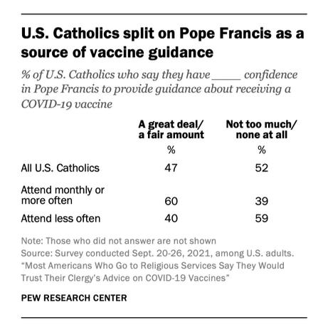 Interestingly, a subsequent Pew Research survey conducted later in 2021 asked Catholic respondents about the level of confidence they had in Pope Francis to provide guidance about the vaxxxine.