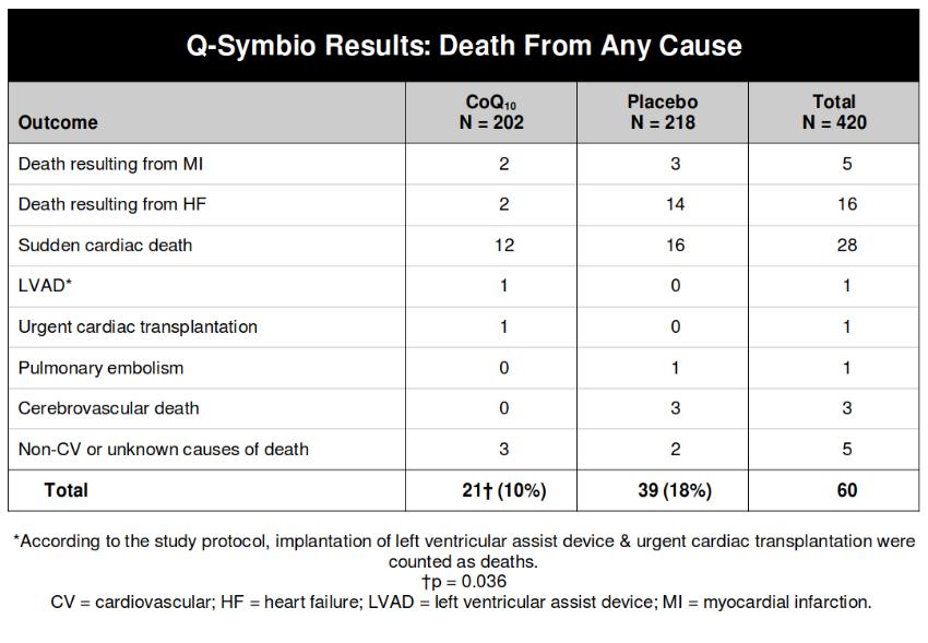 As the figure below shows, there were far fewer heart failure deaths in the CoQ10 group. Sudden cardiac and stroke deaths were also lower in the CoQ10 group.