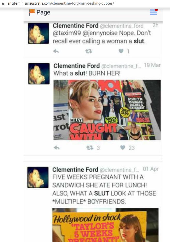To be fair, Ford doesn’t just hate men. She also hates women. At least the young, attractive ones (ever seen an attractive militant feminist? Me neither). Here she is, in the belief she can mend Taylor Swift’s errant ways by calling her a “slut” and calling for her immolation - and then disingenuously pretending she never said such a thing.