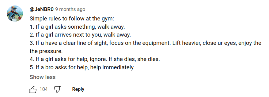 In response to the fake gym creep video sensation, one male YouTube commenter offered the following helpful guide:
