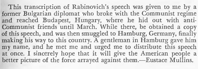 For that, we have to rely on the word of late white supremacist author Eustace Mullins, who just happens to be the sole source of the Rabbi Rabinovich speech. He first wrote about it in a 1952 issue of the Women’s Voice, which contained this footnote: